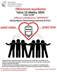 ΠΡΟΣΚΛΗΣΗ ΣΕ ΑΙΜΟΔΟΣΙΑ – ΤΡΙΤΗ 13 ΜΑΪΟΥ 2025 – AΛΕΞΑΝΔΡΕΙΑ ΠΑΝΕΠΙΣΤΗΜΙΟΥΠΟΛΗ ΔΙΠΑΕ