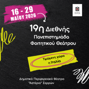 Γραμματεία Εσωτ. Αρχιτεκτονικής Ανακοινώσεις γραμματείας, Μόνιμες ανακοινώσεις 26 Ιανουαρίου 2026 Δεν επιτρέπεται σχολιασμός στο 19η Διεθνής Πανεπιστημιάδα Φοιτητικού Θεάτρου 19η Διεθνής Πανεπιστημιάδα Φοιτητικού Θεάτρου ΠΡΟΣΚΛΗΣΗ – ΠΡΟΚΗΡΥΞΗ ΣΤΗΝ 19Η ΠΑΝΕΠΙΣΤΗΜΙΑΔΑ-2026-ΕΣΩΤΕΡΙΚΟΥ ΦΟΡΜΑ-ΣΥΜΜΕΤΟΧΗΣ 19Η ΠΑΝΕΠΙΣΤΗΜΙΑΔΑ-2026