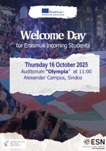 On behalf of the International Hellenic University and the Department of European and International Studies, we are pleased to inform you that on Thursday, October 16th, 2025, at 11:00 a.m., a Welcome Ceremony for Erasmus students will take place in the “OLYMPIA” Amphitheatre at the International Hellenic University for the Winter Semester 2025–2026.