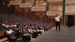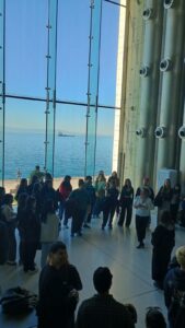 Τη Δευτέρα 24/11/2025 φοιτητές του Τμήματος Εσωτερικής Αρχιτεκτονικής στο πλαίσιο των μαθημάτων Εικαστικά Θέματα Ι, Αρχιτεκτονική Εσωτερικού Χώρου VIII και Ιστορία Τέχνης & Αρχιτεκτονικής Ι, με διδάσκοντες τον κ. Σπύρο Κόκκινο, την κ. Βίκυ Κερτεμελίδου και τον κ. Ιωάννη Δίγκα, επισκέφθηκαν και ξεναγήθηκαν από την κ. Κοκκινίδου στα δυο κτήρια που στεγάζουν το Μέγαρο Μουσικής Θεσσαλονίκης. Στο κτήριο Μ1 είχαν την ευκαιρία να ανέβουν στην σκηνή, να μπουν στα παρασκήνια και να επισκεφθούν και τα καμαρίνια. Το κτήριο Μ2, σχεδιασμένο από το διάσημο αρχιτέκτονα Αράτα Ισοζάκι, χαρίζει στην πόλη μια μοναδική κατασκευή που συνοψίζει τις αρετές της μοντέρνας αρχιτεκτονικής. Γεωμετρικές γραμμές, μεγάλες γυάλινες επιφάνειες και μεταλλικά στοιχεία συνθέτουν μια εικόνα επιβλητικής απλότητας, που έρχεται σε αντίθεση αλλά στέκεται ισότιμα δίπλα στο γειτονικό Μ1. Γεμάτο φυσικό φως, το φουαγιέ του νέου κτιρίου απολαμβάνει μια εξαίσια θέα.